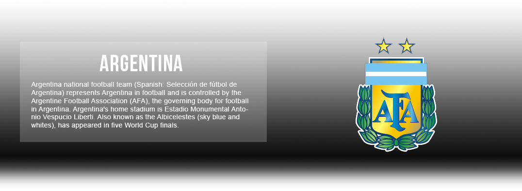 La selección de fútbol de Argentina ( Selección de fútbol de Argentina ) es un equipo de fútbol masculino profesional que representa a Argentina en competiciones contra otros países. Últimamente, Argentina ha demostrado ser uno de los equipos más impresionantes del mundo, a menudo clasificándose entre los 5 primeros según la FIFA. Argentina tiene múltiples títulos en la Copa Mundial de la FIFA, la CONMEBOL-Copa de Campeones de la UEFA y muchos otros torneos internacionales. Con su continuo éxito, Argentina ha desarrollado rivalidades con muchos de los otros mejores equipos nacionales de fútbol comoBrasil,Francia,Inglaterra,AlemaniayUruguay.