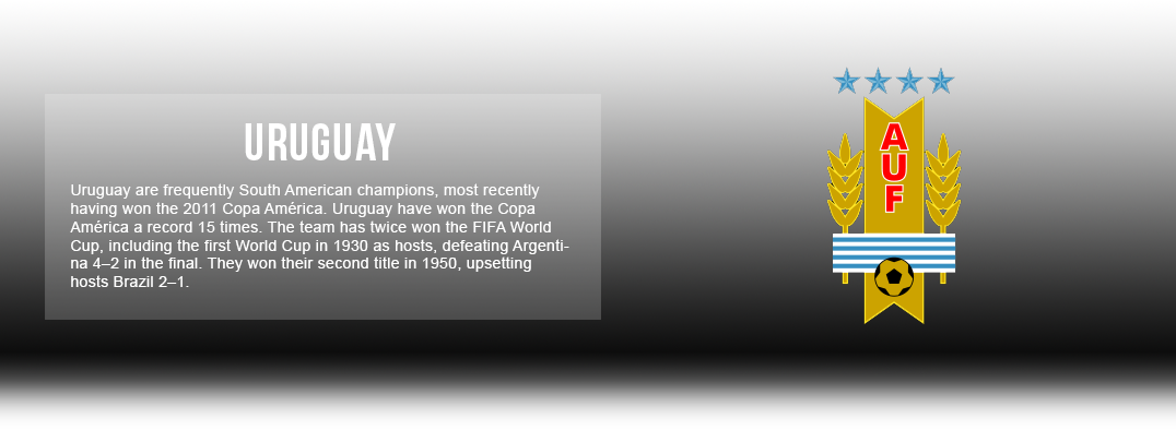 La selección de fútbol de Uruguay (Selección de fútbol de Uruguay) es un grupo de futbolistas profesionales que representan al país en el escenario mundial. Fundado en 1900, el equipo a menudo se conoce comoLa Celeste(El azul cielo) debido al color de sus camisetas. Uruguay también ha competido en un total de 14 Copas del Mundo, y ganó tanto en 1930 como en 1950. También tiene más de una docena de campeonatos de Copa América desde 1916. En estos días, las mayores rivalidades de Uruguay son conArgentinayBrasil.