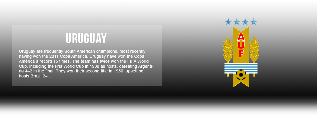 La selección de fútbol de Uruguay (Selección de fútbol de Uruguay) es un grupo de futbolistas profesionales que representan al país en el escenario mundial. Fundado en 1900, el equipo a menudo se conoce como La Celeste (El azul cielo) debido al color de sus camisetas. Uruguay también ha competido en un total de 14 Copas del Mundo, y ganó tanto en 1930 como en 1950. También tiene más de una docena de campeonatos de Copa América desde 1916. En estos días, las mayores rivalidades de Uruguay son con Argentina y Brasil .
