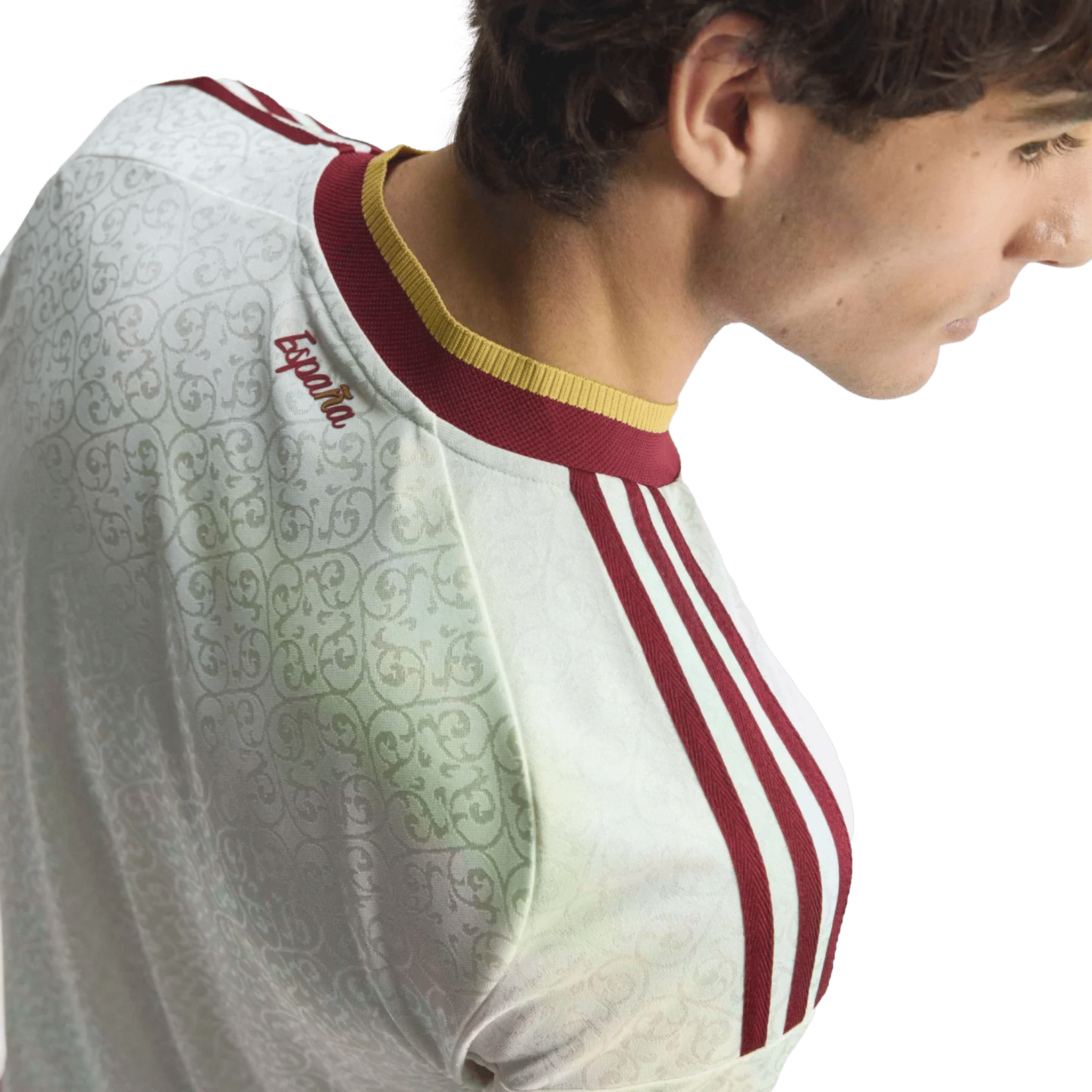 The clean white base is elevated with modern design accents inspired by Spain’s rich football heritage, delivering a bold yet refined look that stands out wherever you go. Lightweight, breathable fabric keeps you cool under pressure, while advanced moisture-wicking technology ensures maximum comfort whether you're playing or cheering from the stands.