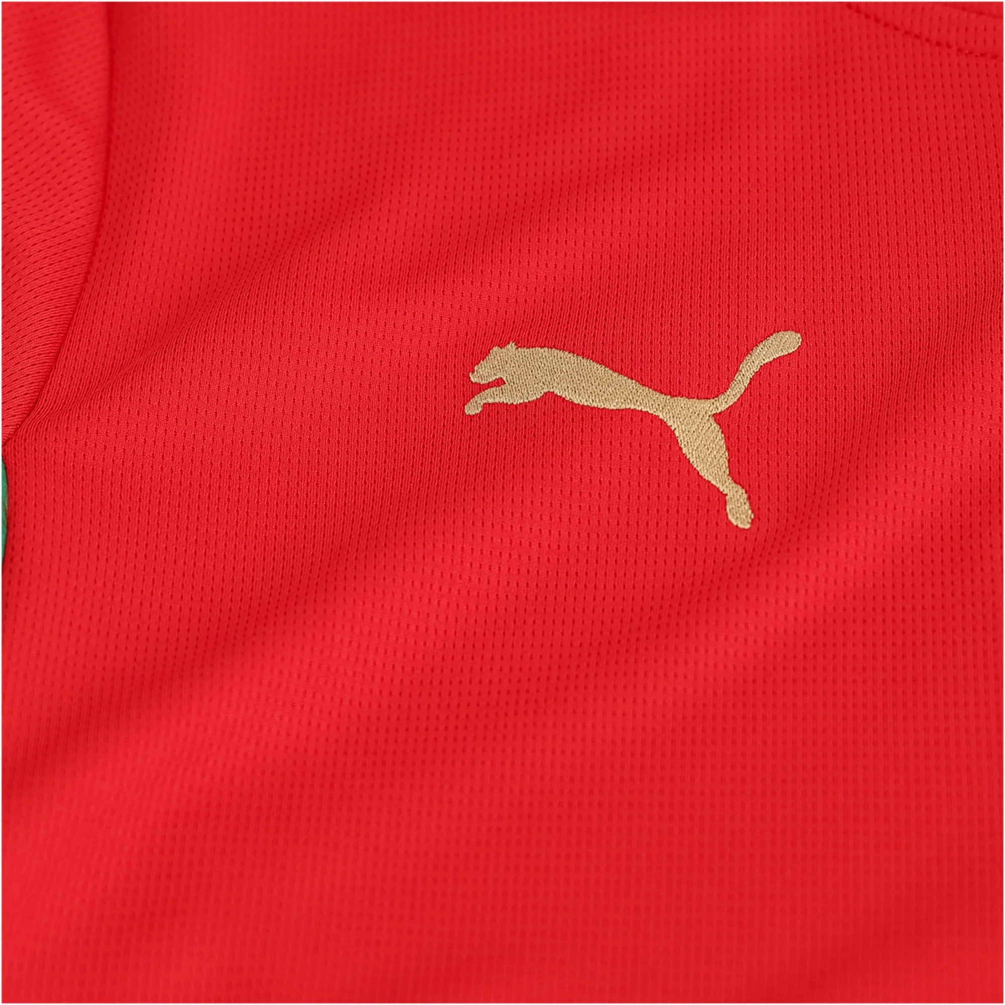 The 2026 Morocco Home jersey is in the traditional red, incorporating green in the patterned collar and cuffs.