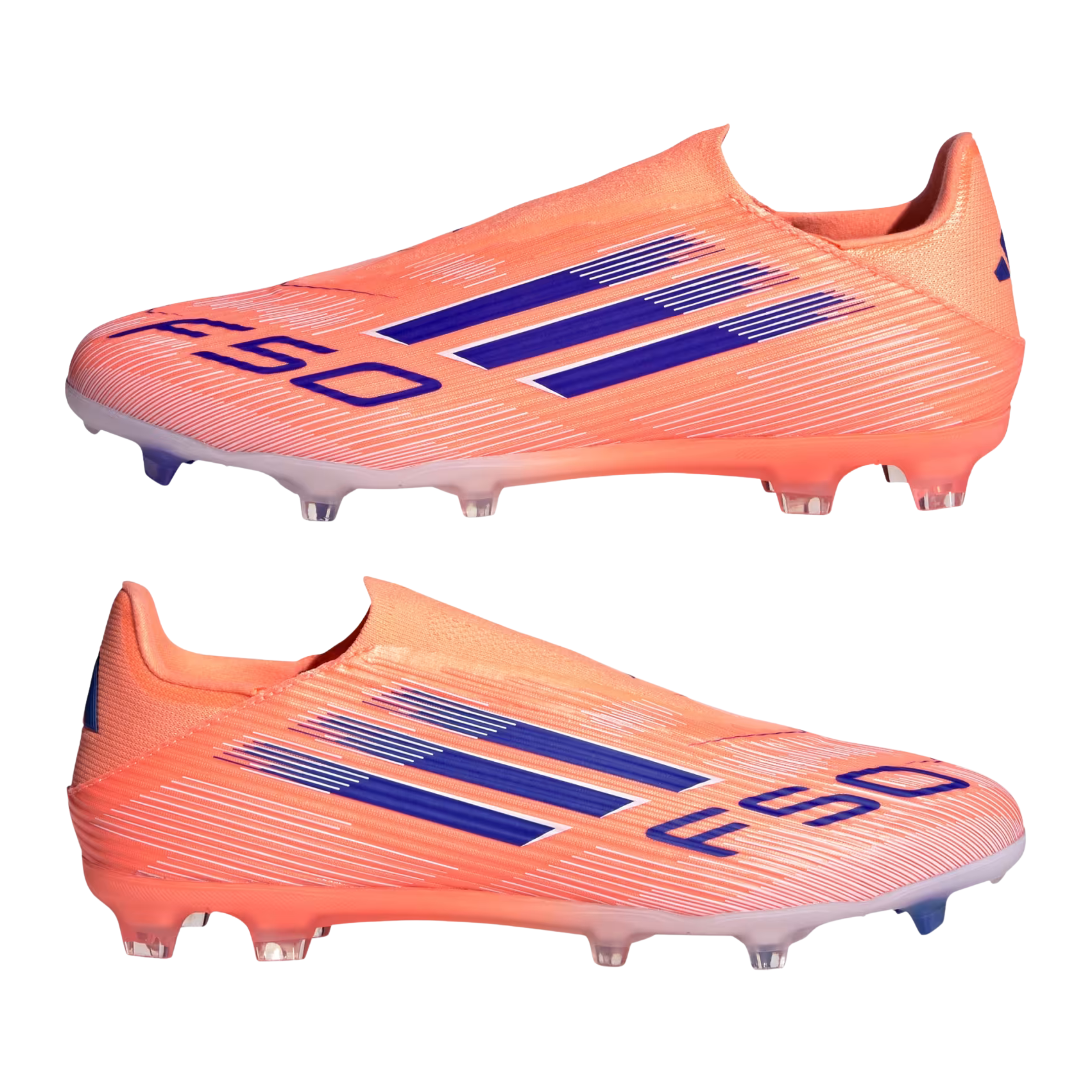 Step into speed with the adidas F50 League Laceless Firm/Multi Ground Soccer Cleats in Orange, Lucid Blue, and White. Designed for dynamic players, these boots offer a laceless fit for a seamless strike zone and improved control.