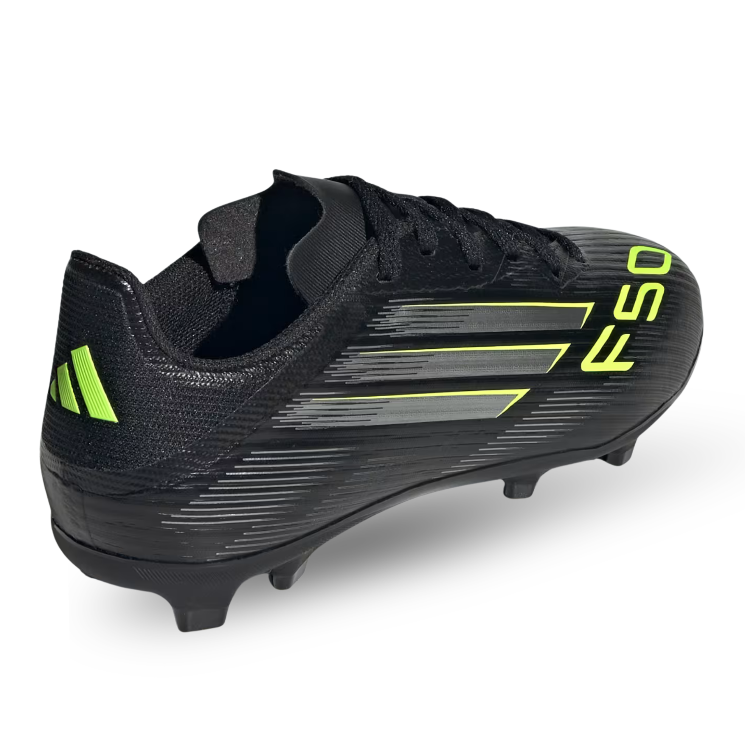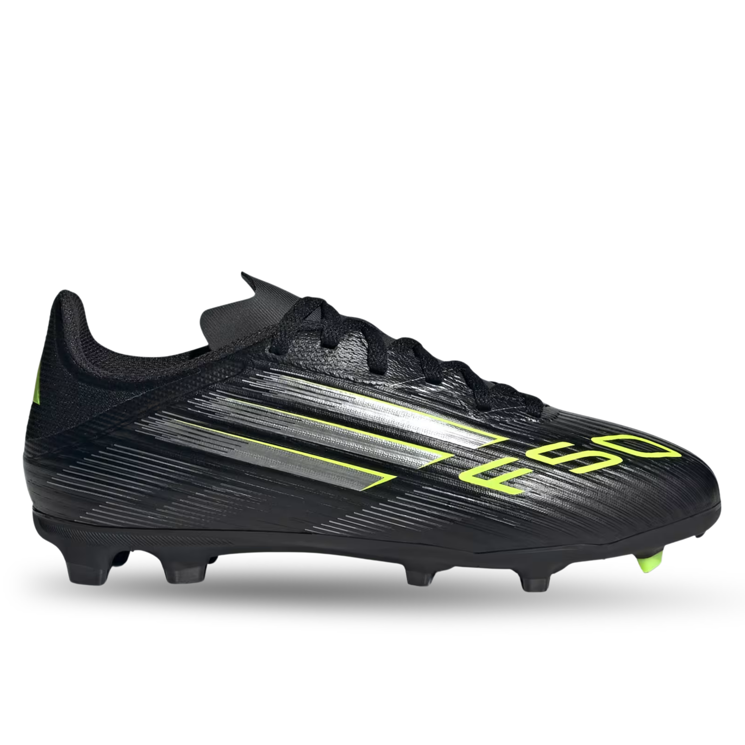 Ignite your speed with the adidas F50 League FG/MG Junior Soccer Cleats, designed for young game-changers. The sleek black upper with Iron Metallic accents and Lucid Lemon pops delivers a fast look, while the lightweight synthetic construction and firm/multi-ground outsole offer explosive acceleration and agile traction across natural and artificial surfaces.