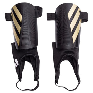 Equip your young athlete with the adidas Youth Tiro Match Shin Guards, designed for both protection and comfort on the pitch. Featuring a durable hard shield, these guards are backed with EVA foam to absorb impacts effectively. An integrated padded ankle guard offers additional coverage, while the adjustable hook-and-loop front closure ensures a secure and customizable fit. The sleek black design with gold metallic and white accents adds a touch of style to their game-day gear.