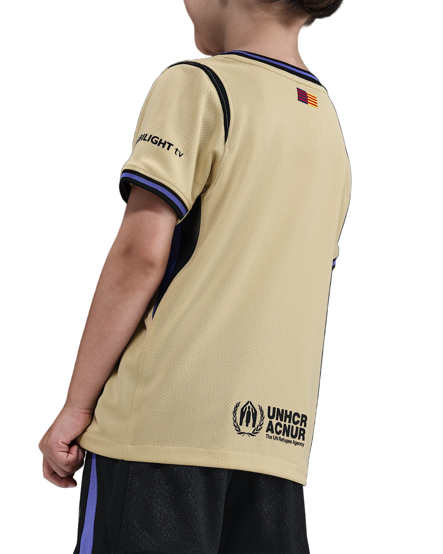 Dress your future star in full Barça pride with the Nike Barcelona 25/26 Little Kids 3-Piece Away Kit, featuring the vibrant Team Gold jersey with Persian Violet and Black accents. Inspired by the club’s official away design, this set brings authentic style to the next generation of fans.